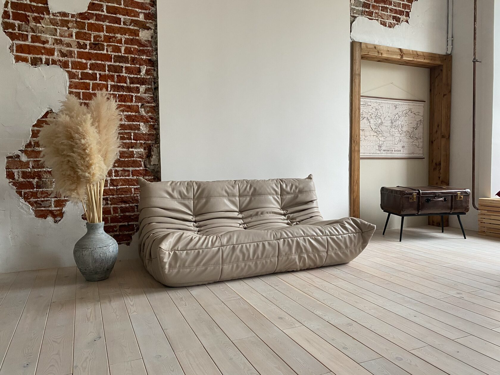 Мягкий и удобный диван в обивке с эффектом мятой кожи благородного коричневого цвета.